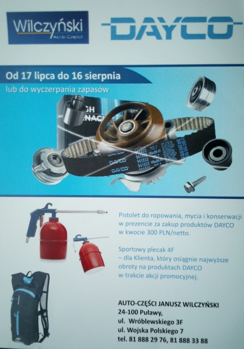 Za zakup produktów Dayco w kwocie 300pln/netto pistolet do ropowania. Sportowy Plecak 4f dla kienta który osiądnie najwiekszy obrót na produktach Dayco